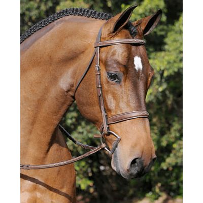 An Arc de Triomphe Signature Bridle, designed for sponsored rider Scott Stewart, this is a non-padded hunter style. With a choice of 3 widths of noseband (7/8" for Pony, 1" for Cob Size or 1.25" for Full Size), you can really create a more balanced look that’s right for your horse. Browband measures 7/8" and cheeks are 5/8" with stainless steel hook stud ends and Herm. Springer hardware. Bridle comes complete with Raised Fancy Laced reins. Brown Only.
