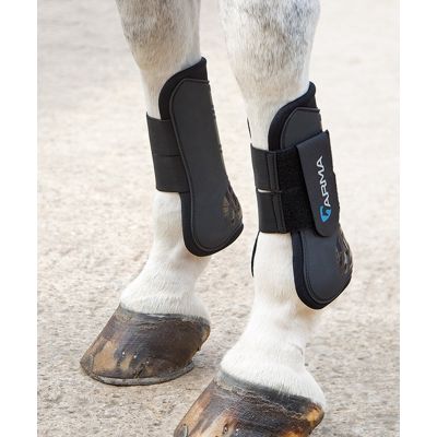Offering protection to vulnerable areas whilst open straps allow the horse to feel his way. These ARMA open fronted tendon boots have a flexible, impact resistant hard outer shell which deflects blows on contact. The dense, perforated neoprene lining offers breathable, shock absorbing protection to tendons. Ergonomically shaped with smooth, rounded edges and recessed stitching for durability. Featuring double touch close fastenings with stretch inserts for comfort and security.