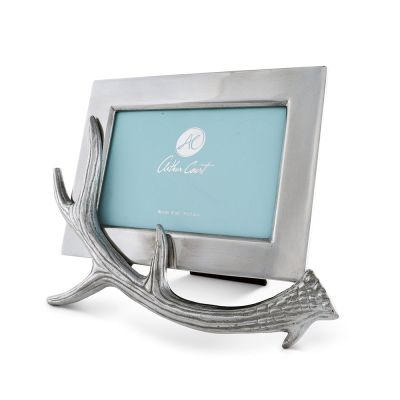 A realistically fashioned antler curves along the bottom and runs up the left side of this piece as a beautiful, naturally appealing accent. The realistic detail within the antler's burr and beam highlights this handmade, aluminum frame.