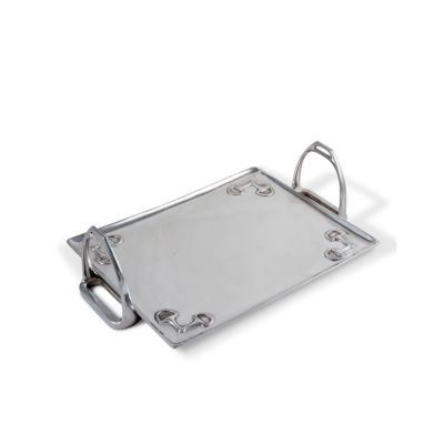 Featuring a square shape, generous size with realistic stirrup irons serving as the handles, sleek equestrian design defines our large Arthur Court Equestrian Bit and Stirrups Serving Tray. Slightly raised edges allow for carrying without worry. Bas-relief D-bit designs decorate the four corners of the tray. This tray is highly engravable, with plenty of space for messages, just take to your local engraving shop when you receive it.