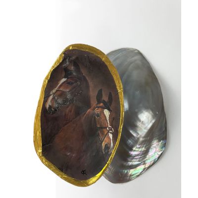 Each Shell has been meticulous crafted. A picture of a horse has been used and decoupage secures it to the shell. When that is completed than the artist hand paints to enhance and high lights the horses features. Theshell’s edge is then trimmed gold paint
