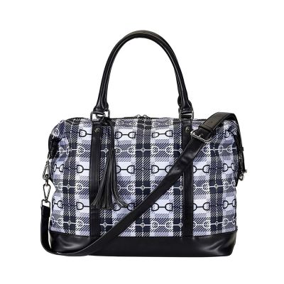 This snaffle bit plaid travel bag comes fully lined with zippered top, accessory and zippered interior pockets. Large zippered back pocket on back of bag. Carry handles and adjustable, removal shoulder strap, decorative tassle is also removable. 21"W x 14"H x 7.5D