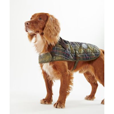 Quilted Barbour tartan dog coat with plain nylon lining. Cord collar detail and Velcro fastening underbody strap.