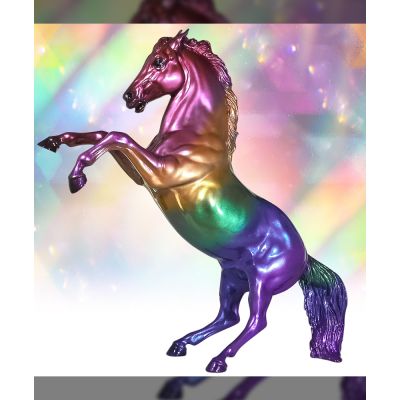 A rainbow is always a special sight to behold, but when it appears on a fiery rearing horse, it becomes something truly spectacular! This impressive stallion’s coat is decorated with rich jewel-toned hues that together make up an exquisite rainbow. From the tip of his ruby ears to the violet ends of his tail, he’s a splendid masterpiece to behold. Like the jewels that inspired his coloring and name, his metallic coat has a beautiful shiny luster. The iconic Fighting Stallion was sculpted by artist Chris Hess, and was introduced to the Breyer lineup in 1961. Over the years, the Fighting Stallion has donned numerous realistic patterns as well as a few decorator colors, but this is his first time appearing with a rainbow coat.
