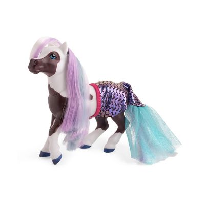 While she loves playing with her friends on the land, this mer-pony princess is at home in the water. Dip her in warm water to see her markings, hooves, mane, and tail change color! After her swim, dress her in the shimmery mermaid tail blanket, and finish off her look by brushing her hair and putting on her crown.