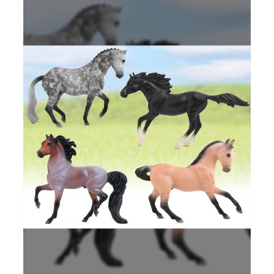 This new 4-piece set includes a bay roan Morgan Cross, a dunskin American Warmblood, a black Mustang, and a dapple grey Hanoverian.