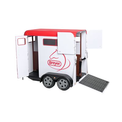 It's time to hit the road with your model horses! This authentically-detailed traileris perfect for all of your Breyer Traditional® Series horses and looks great parked next to your Breyer barn. It features room for two horses, with stalls separated by a divider, padded rear chains, two back doors with Dutch openings, four working tires, a side door, and a hitch! It can be hitched to the Breyer Dually Truck (sold separately). Let the adventures begin!