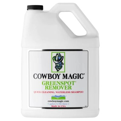 Cowboy Magic Green Spot Remover (1 Gallon) It is concentrated: Greenspot® Remover/Shower in a Bottle is made from very expensive, natural, non-sudsing cleaners derived from plants. It works instantly: Breaks down foreign molecules and dissolves manure, urine, dirt, and sweat, melting them away. It is a deep conditioner: This product has added silk and panthenol to strengthen the hair and condition the skin. It creates a shine: It also has shea butter to make it possible to brush up a shine after drying. It is important to use a damp towel to activate the ingredients. Follow up with a dry towel to pickup and absorb manure, dirt or sweat. It only takes a small amount: Spray on a small amount and massage it in and wipe it off. Repeat, working on small areas. Spray, massage in, wipe off, spray, massage in, wipe off. It works on people too: Greenspot® Remover/Shower in a Bottle is great for campers and mountain bikers who want to clean up dirty, smelly bodies without using lots of water. The only water needed is to wet the towel to activate the ingredients that break down the sweat or dirt. Follow up with a dry towel to remove the sweat or dirt.
