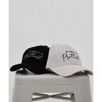6-panel, unstructured baseball hat with Dancing Equestrian's signature 'My Horse is the Prettiest' embroidered in white or black stitching.