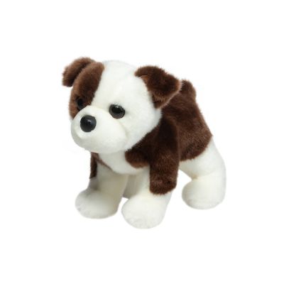 Brimming over with endearing Bulldog puppy charm, Clive is our plush rendition of this courageous breed! Developed in England in the Middle Ages, the Bulldog has become the laid back, playful family pet that we know today Clive’s design captures the stocky body and small floppy ears that one would expect from the breed. The compact shape of Clive’s head features a stout muzzle and large, brown eyes. Chocolate colored spots pattern his short plush coat of white fur. His stand up pose is supported by soft, resilient polyester fiber that allows durability while still retaining huggable softness. Adopt Clive the Bulldog puppy stuffed animal, his winsome personality will make him an instant favorite!