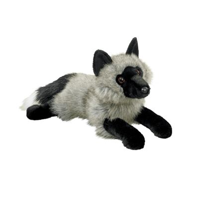 Sleek and handsome, Sterling the DLux plush Silver Fox will catch your eye with his unusual coat color! Silver Foxes are dark color morphs of the more commonly known Red Fox. Sterling features the typical black leg stockings of his species but instead of having a russet colored coat, it’s silvery gray and the faux fur hairs feature lifelike black tips. He features a floppy body style that we’ve gently weighted with beans in each of his paws. A pair of triangular, black ears lend alertness to Sterling’s amber-eyed expression, while a flashy, white tail tip completes his realistic appearance. A must for Fox lovers of all ages, let yourself be captivated by the allure of this unusual Silver Fox stuffed animal!