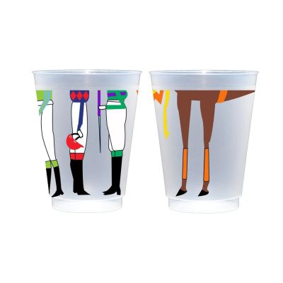 These 16 oz frosted plastic horse racing cups have a an illustration of six brightly-colored horse jockey legs in their silks and a horse dressed for horse racing.
