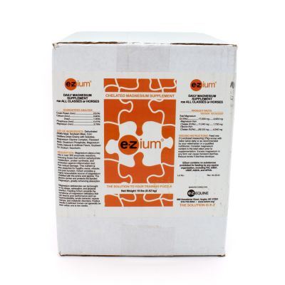 EZium is a daily equine supplement that provides a unique source of magnesium, chelated for maximum absorption. Magnesium deficiencies can be brought on by stress, adrenaline, and physical exertion. Feeding EZium daily prevents the symptoms of magnesium deficiency that can lead to poor performance such as hyperexcitability, erratic behavior, muscle cramps, and metabolic disorders. Positive results in deficient horses can generally be seen within one to two weeks. 19 lbs of EZium in an easy to store, recyclable box. Use directly from the twist tie sealed bag inside the box or use to refill a two-month pail. Contains a two-month supply at the recommended dose of one scoop twice a day.
