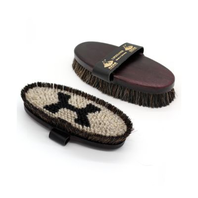 An exclusive horse hair mixture is used for this brush. The border is edged with longer black horse hair. The shorter bristles are for gentle cleaning and the longer are for removing dust and creating a glossy finish.