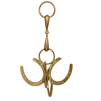 Add a touch of class to your tack room with this Solid Horseshoe and snaffle bit motif tack cleaning hook, bridle hanger or blanket hanger. The solid snaffle bit hanger is connected to four solid horseshoes, for a unique design that will stand out in any barn. Hang outside your stalls to keep your horse blankets and sheets off the floor or in a tack room for bridle, girths, halters and more. Lacquer protected for long lasting finish.