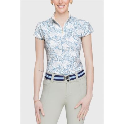 Embrace style and performance with this season's Modern Poppy Print Cap Sleeve Shirt, featuring a chic chambray and sky-blue floral design on a light cream background. Designed for versatility, this feminine cap sleeve silhouette is perfect for the barn, the green, and all your athletic pursuits. Crafted with UPF 30 protection and soft 4-way stretch fabric, this shirt ensures comfort and functionality throughout the day.