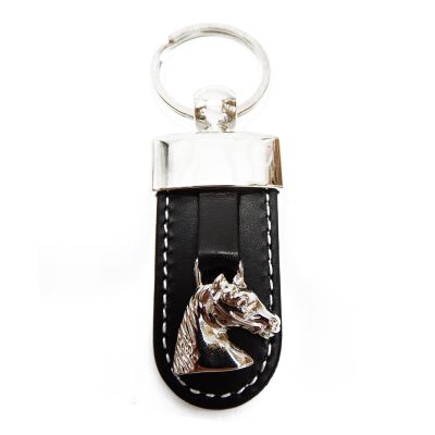 This stylish "Thomas" key ring has a shinny Roman horse head profile set on beautiful Spanish leather. Makes a great gift for a man or woman! Spanish vaqueta bridle leather is combined with silvertone hardware.