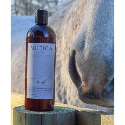 A leave-on formula to aid in treatment of rain rot, ringworm, leg scurf, and other skin diseases. A blend of sulfur and essential oils kills the infection while the unique base leaves the skin smooth and conditioned. Most other leave-on formulas are greasy and smelly; not only is this unpleasant for the owner, but the grease can provide a moist and protective environment for the fungus and bacteria. Medica Lotion delivers effective treatment in a non-greasy, smooth base.