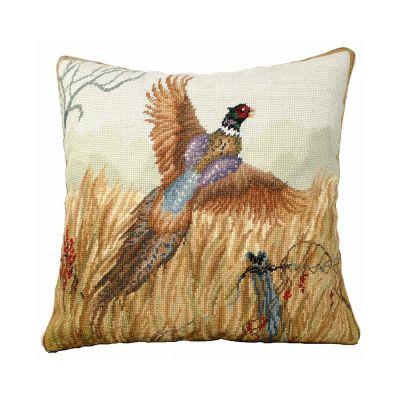 Pheasant in Flight is a beautiful handmade 18"x18" needlepoint pillow. Rich browns, golds, blue, purple, and red make up the realistic detail of the lovely pheasant. A field of grasses and a fence border the edge of the pillow. Soft sky of pale greens top the pillow. Beige cotton velvet zippered back