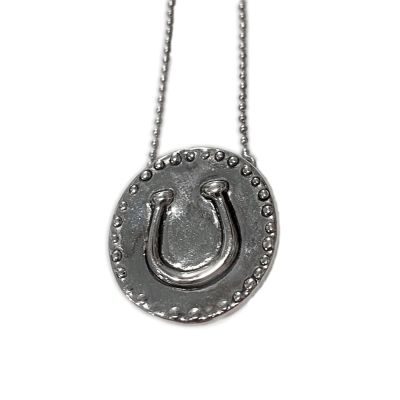 Sterling silver pendant with stamped horseshoe on a beaded chain.