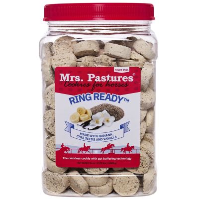 Mrs. Pastures is baking a cookie unlike any other! Ring Ready™ is specifically designed to be fed before or during riding. Its colorless appearance keeps you and your horse looking “Ring Ready.” Designed with horses in mind, this cookie features gut buffering technology to help horses cope with stress. Featuring organic banana and organic vanilla, along with pure cane sugar, this treat is ready to earn its place in your daily training and competition routine.