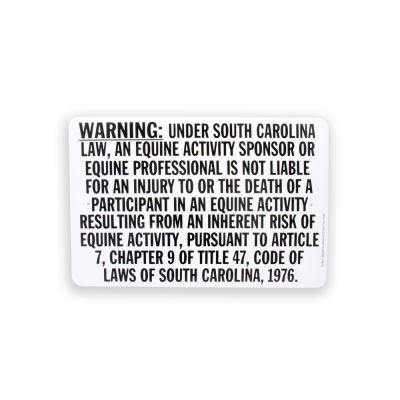 "Warning: Under South Caroliuna law, an equine activity sponsor or equine professional is not liable for an injury to or the death of a participant in an equine activity resulting from an inherit risk of equine activity, pursuant to article 7, chapter 9 of title 47, code of laws of South Carolina, 1976."