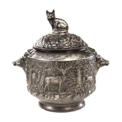 This lovely Stag And Deer Scene Relief Tureen is a rustic style silver relief carved stag and deer scene tureen. It measures 12 inches wide, 11 inches deep, and 12 inches high, and is made of resin. This gorgeous piece is perfect for a home with a rustic or even transitional style decor!