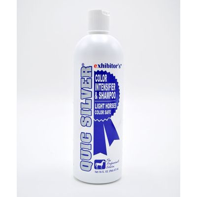 Quic Silver Color Intensifying Shampoo intensifies all light colors within a coat. It highlights silver in grays, draws out gold in palominos and accentuates platinum in white. It contains no bleaches, bluing or other harsh chemicals. Quic Silver Color Intensifying Shampoo is effective in removing tough stains including grass, manure and urine. It also removes scuff, in a deep cleaning.