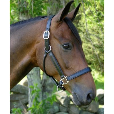 Black, padded leather halter with black stitching and brushed nickel fittings.