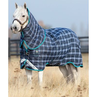 Rhino Plus pony turnout medium weight blanket with unique barrier technology comes with anti-static and anti-bacterial polyester lining and thermobonded fibrefill for longer lasting heat retention. Detachable hood included as standard.