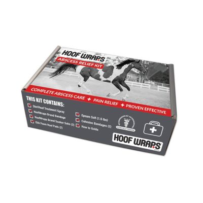 Hoof Wraps Abscess Relief Kit SteriHoof Spray: Clinically proven to kill 99% of infection causing germs Hoof Wraps Brand Soaker Sacks: For easy soaking - Reusable Hoof Wraps Brand Bandage: Keeps hoof clean and protected after soaking EVA Foam Pads: Protection and relief for sore hoofs Epsom Salt: For Soaking Tack Wrap bandages Step By Step Care Guide