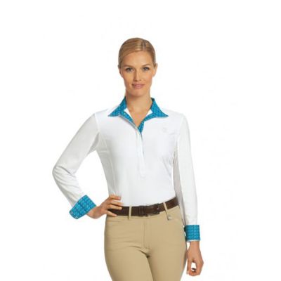 The Stephanie Show Shirt features Chill-Factor fabric with sheer mesh under sleeves to keep you cool, while the woven snap-wrap collar, placket and cuffs give a classic 'equestrian' look. Fun prints hidden inside collar, plackets and cuffs keep it unique. Quiet white top-stitching and logos make this the perfect Hunter Show Shirt. Machine washable.