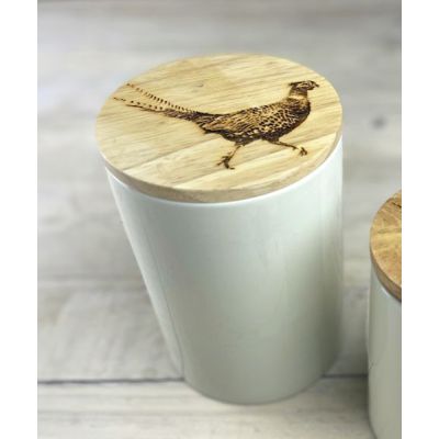 Make a stylish country statement on your kitchen worktop with our new oak and ceramic storage jars. Perfect for storing tea, coffee and sugar or even biscuits or baking ingredients. Oak lid engraved with a striking design.