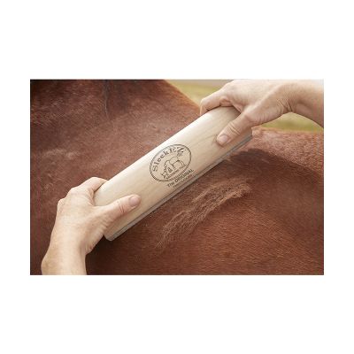 So simple, so effective! Remove loose hair and embedded dirt and dander from the coat year round without irritating your horse. SleekEZ's handle is constructed of poplar wood treated to protect it in the outdoor environment. The comb is designed with a unique, patented tooth pattern exclusive to SleekEZ. This unique tooth pattern is created to be used on a variety of coats from fine to course and long to short. Their exclusive blade will not cut the hair or damage the coat. Just simply swipe the metal teeth with a soft horse brush from your tack box to remove dirt build up, continue brushing and watch that sleek pony appear!