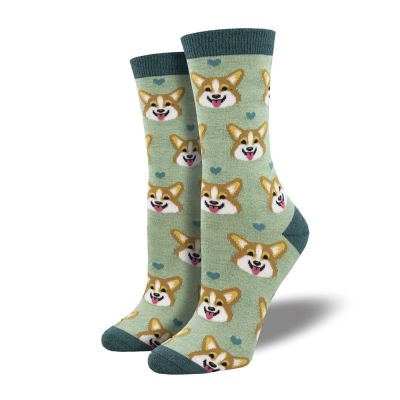 Pair of graphic women's Bamboo socks availible in different styles such as Corgi Face-Pink, Corgi Face-Grn and Ewenique-Grey