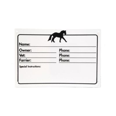 This stall ID Plaque displays important contact information in case of emergencies. These plaques are made of heavy plastic that can be written on with a marker and wipe off the new updates. A must have for any training or boarding stable. Plaque size is 11 1/4" x 7 3/4". Mounting screws are not included.
