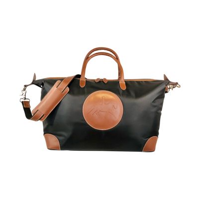 This generous overnight duffle bag is designed with padded heavy/duty 900d black nylon featuring full grain smooth leather accents in tones of chestnut or black. Comfort continues with supple rolled leather handles and an optional, adjustable padded shoulder strap. Refined interior with private zip and open pocket. Finished with silver feet and hardware.