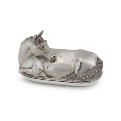 Inject equestrian style into your table setting with this magnificent Horse Butter Dish from Vagabond House. A gorgeous, pure-pewter thoroughbred curls up to rest on top of our elegant stoneware in this design. Featuring an intricate tail and toned muscles, our stallion turns its realistic face back to look at something off in the distance.