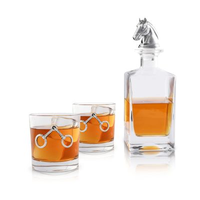 ntroducing the Equestrian Decanter Set with Pair of Glasses, the perfect addition to any equestrian enthusiast's home bar collection! This set includes a single liquor decanter with a 3D horse head stopper and a pair of glasses with a metal bit accent, adding a touch of equestrian charm to your drinking experience. Crafted from high-quality glass, the decanter has a capacity of 750ml, making it perfect for storing and serving your favorite spirits. The 3D horse head stopper adds a unique and elegant touch to the decanter, making it a great conversation starter among guests. The glasses in this set are also made from high-quality glass and feature a metal bit accent on each one, adding a cohesive and stylish look to the set. The glasses have a comfortable weight and a sleek, smooth texture that feels great in your hand, making them perfect for everyday use or special occasions. This Equestrian Decanter Set is ideal for any occasion, whether you're hosting a party or enjoying a quiet night in. It's the perfect gift for any horse lover or equestrian enthusiast, and it's also a great addition to any home bar collection. The set comes in a stylish gift box, making it easy to wrap and present to your loved ones.